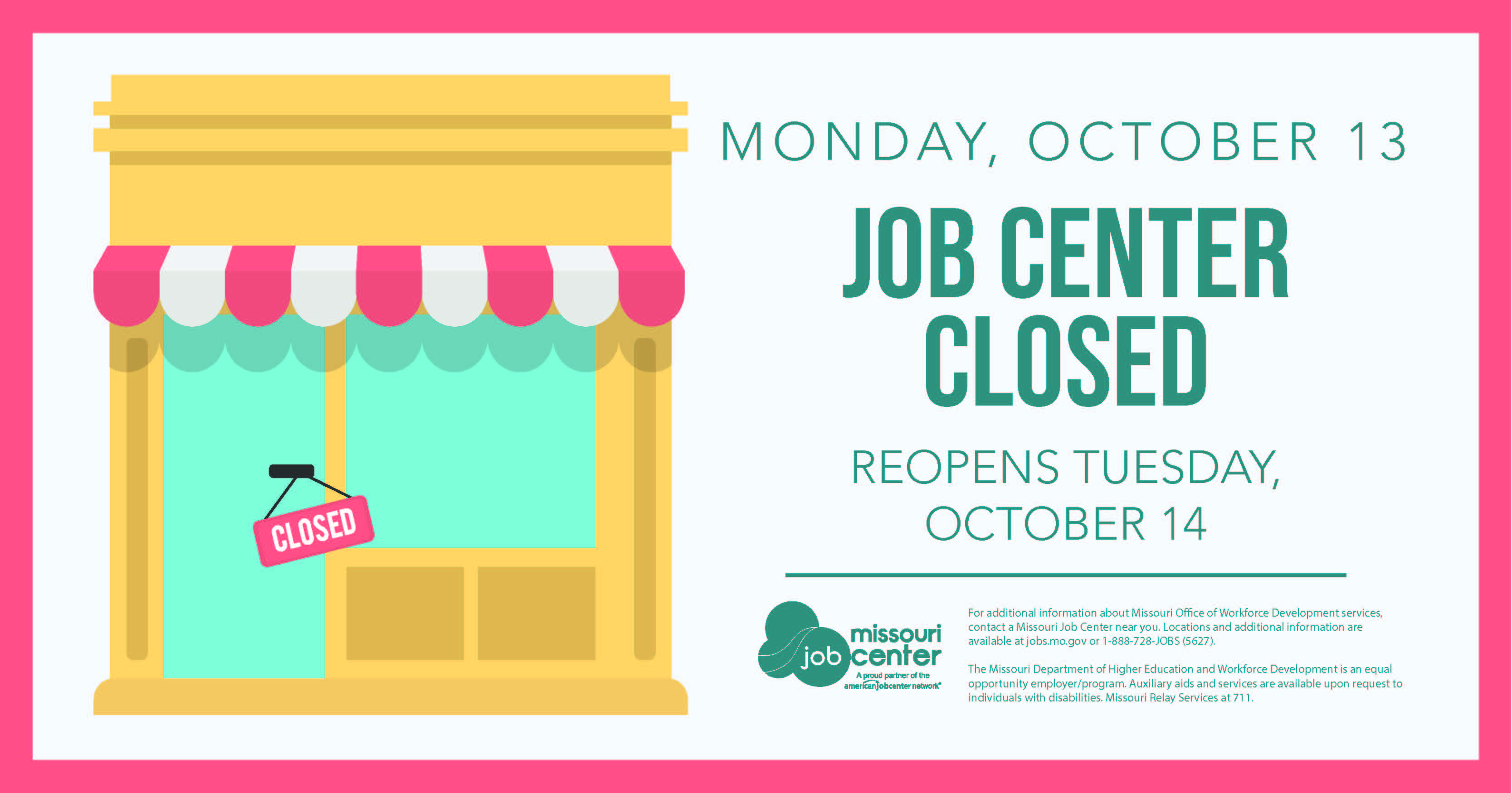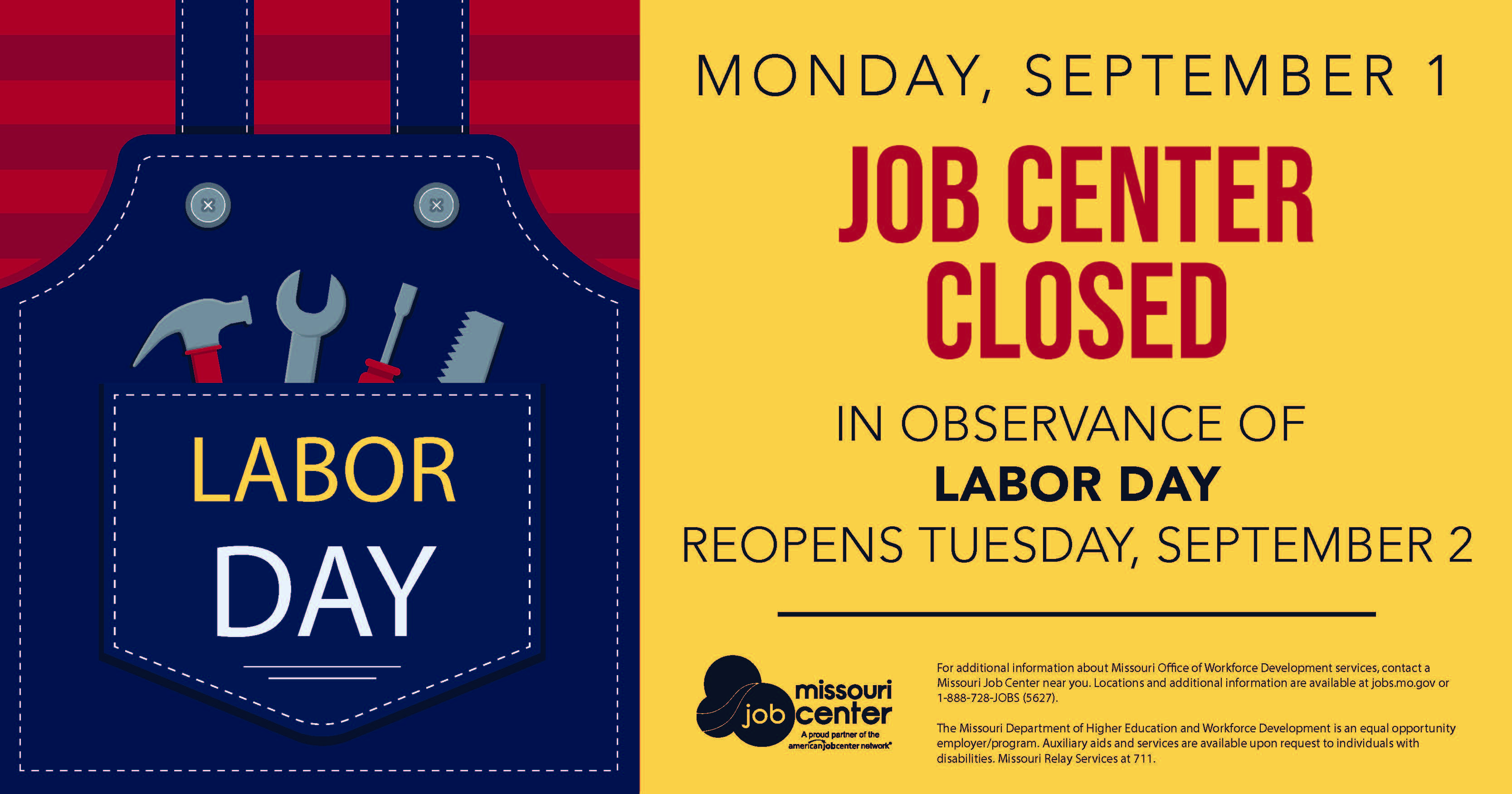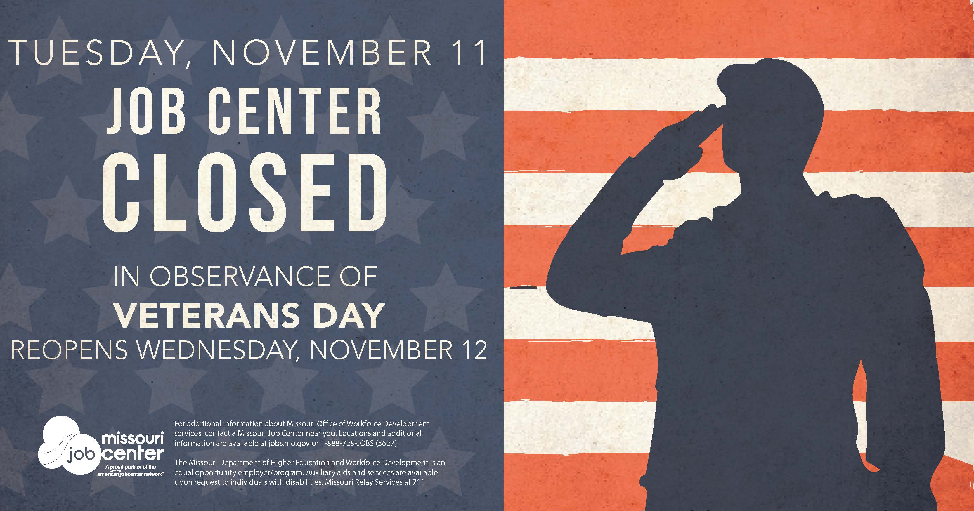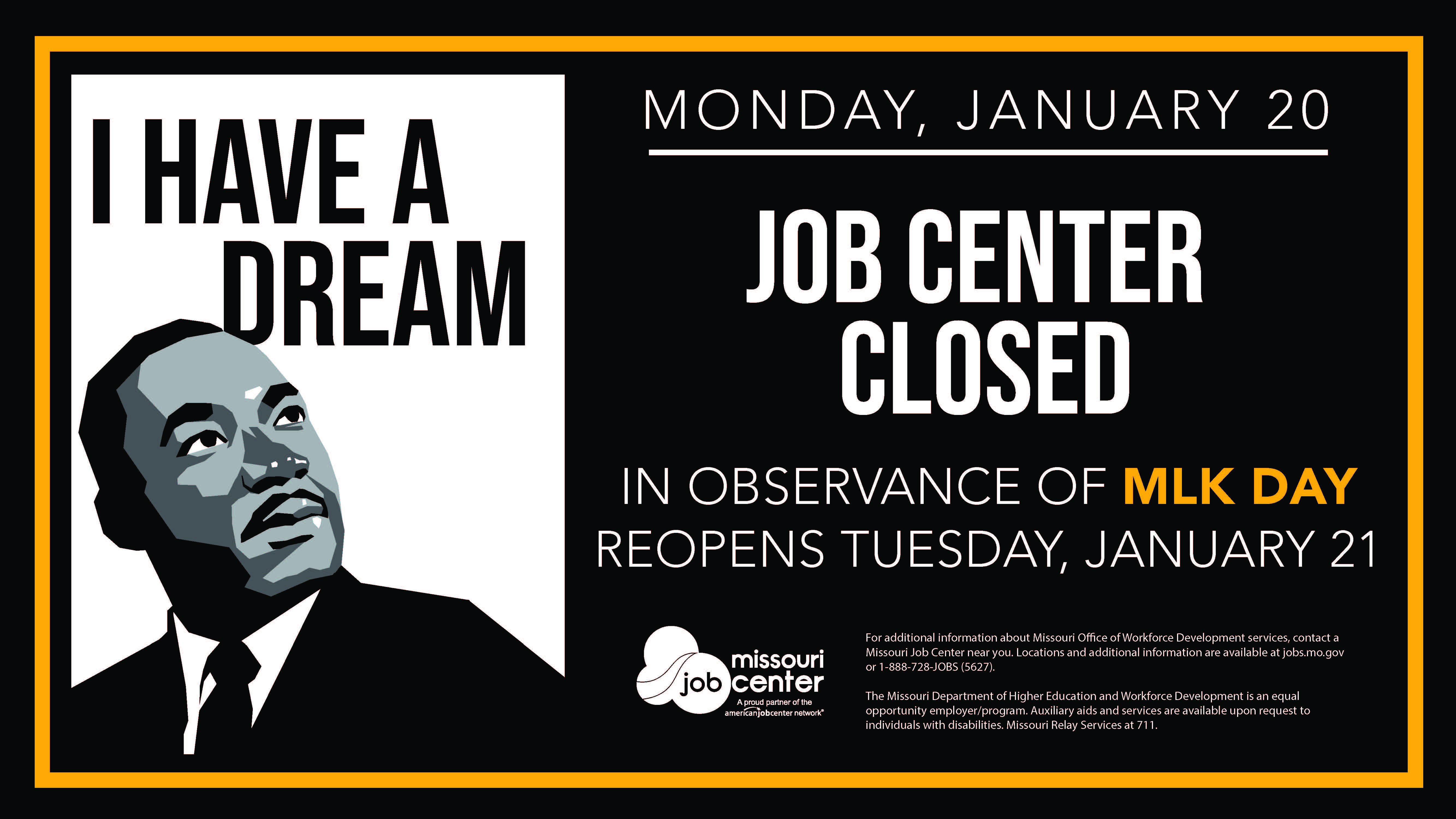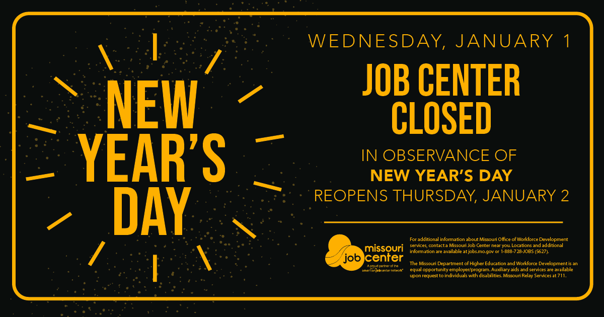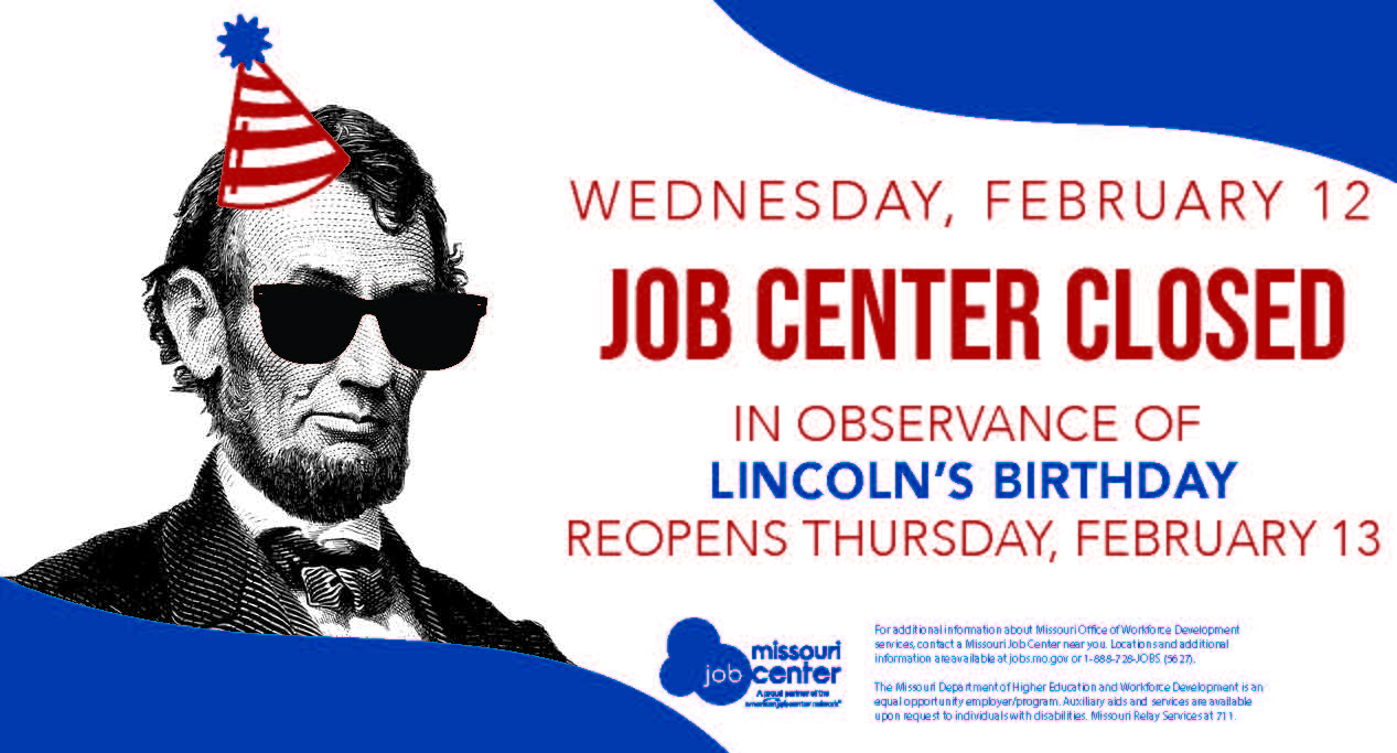 For additional information about Missouri Office of Workforce Development services, contact a Missouri Job Center near you. Locations and additional information are available at jobs.mo.gov or 1-888-728-JOBS (5627).