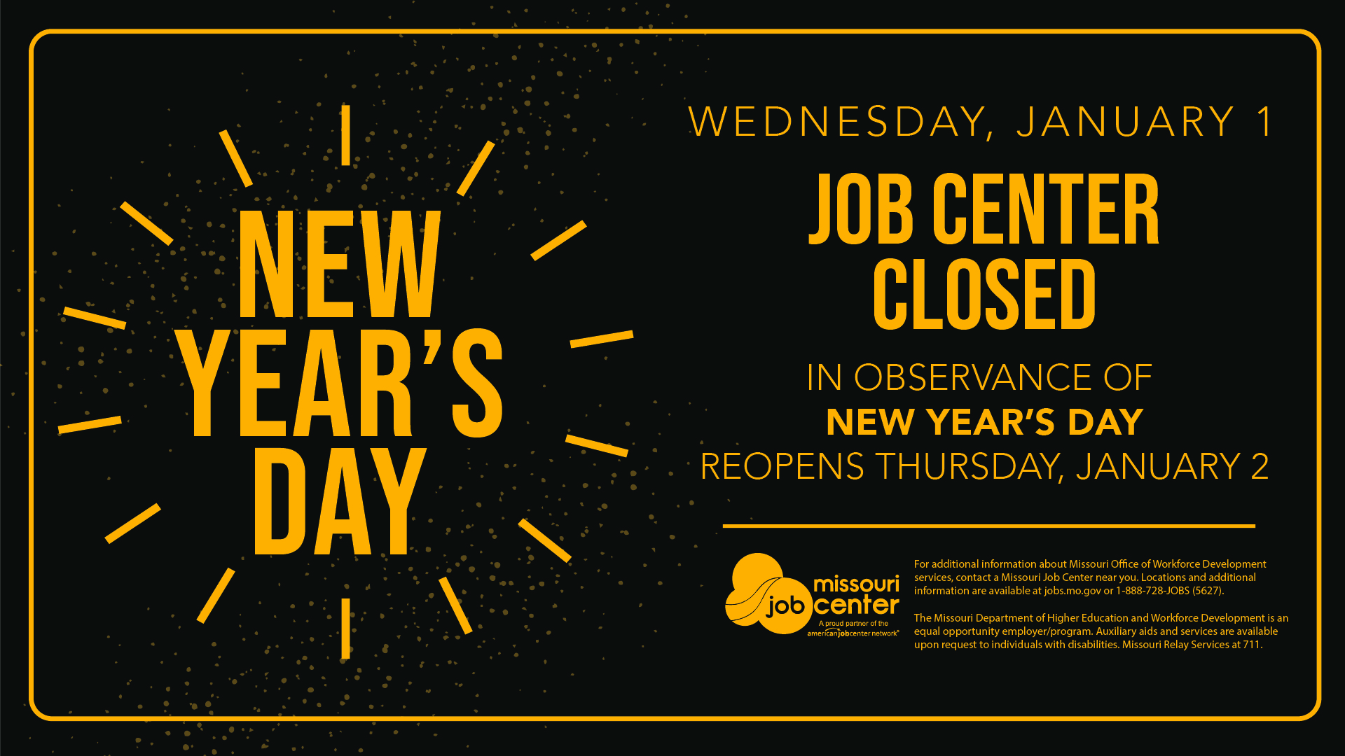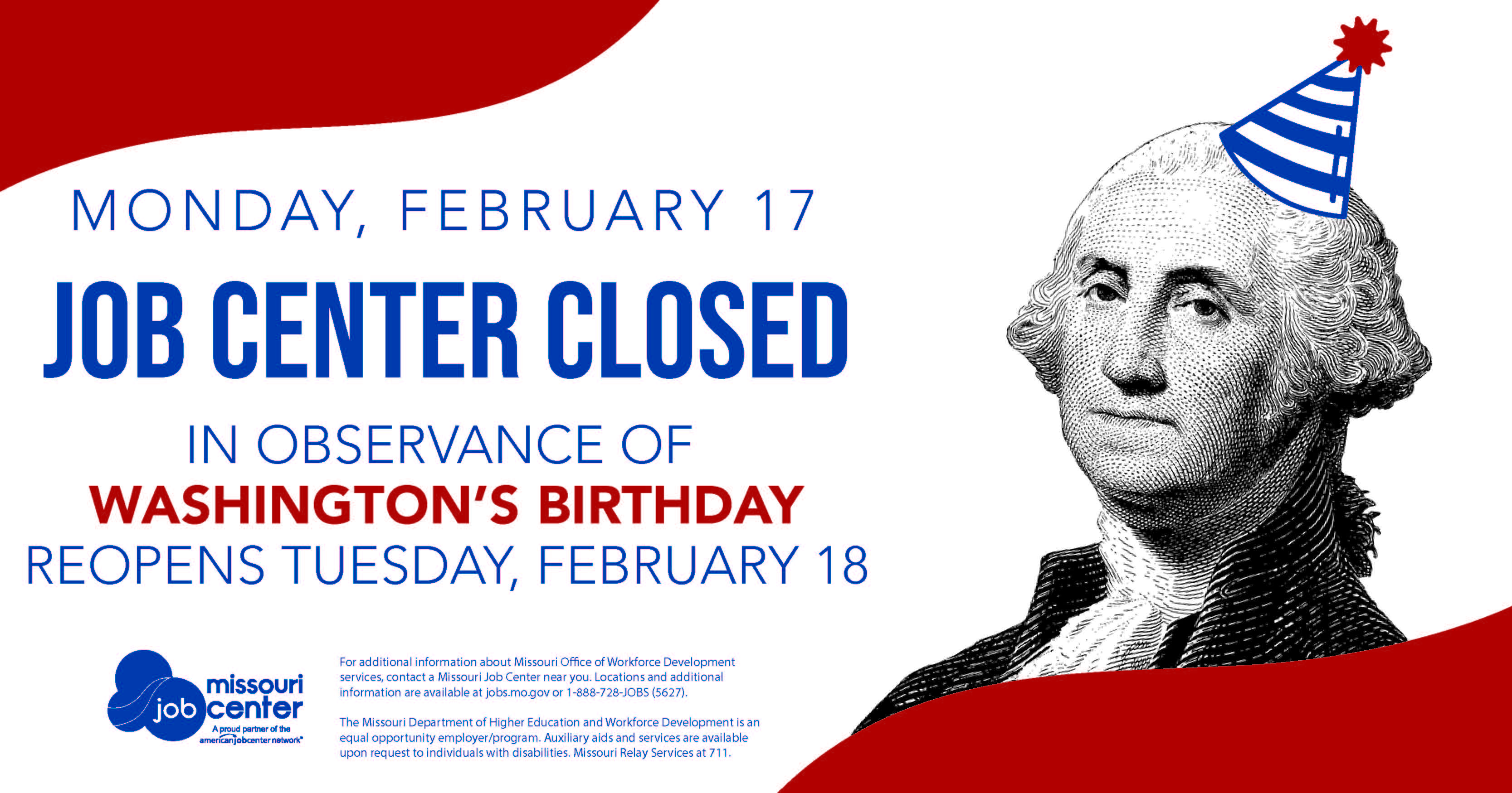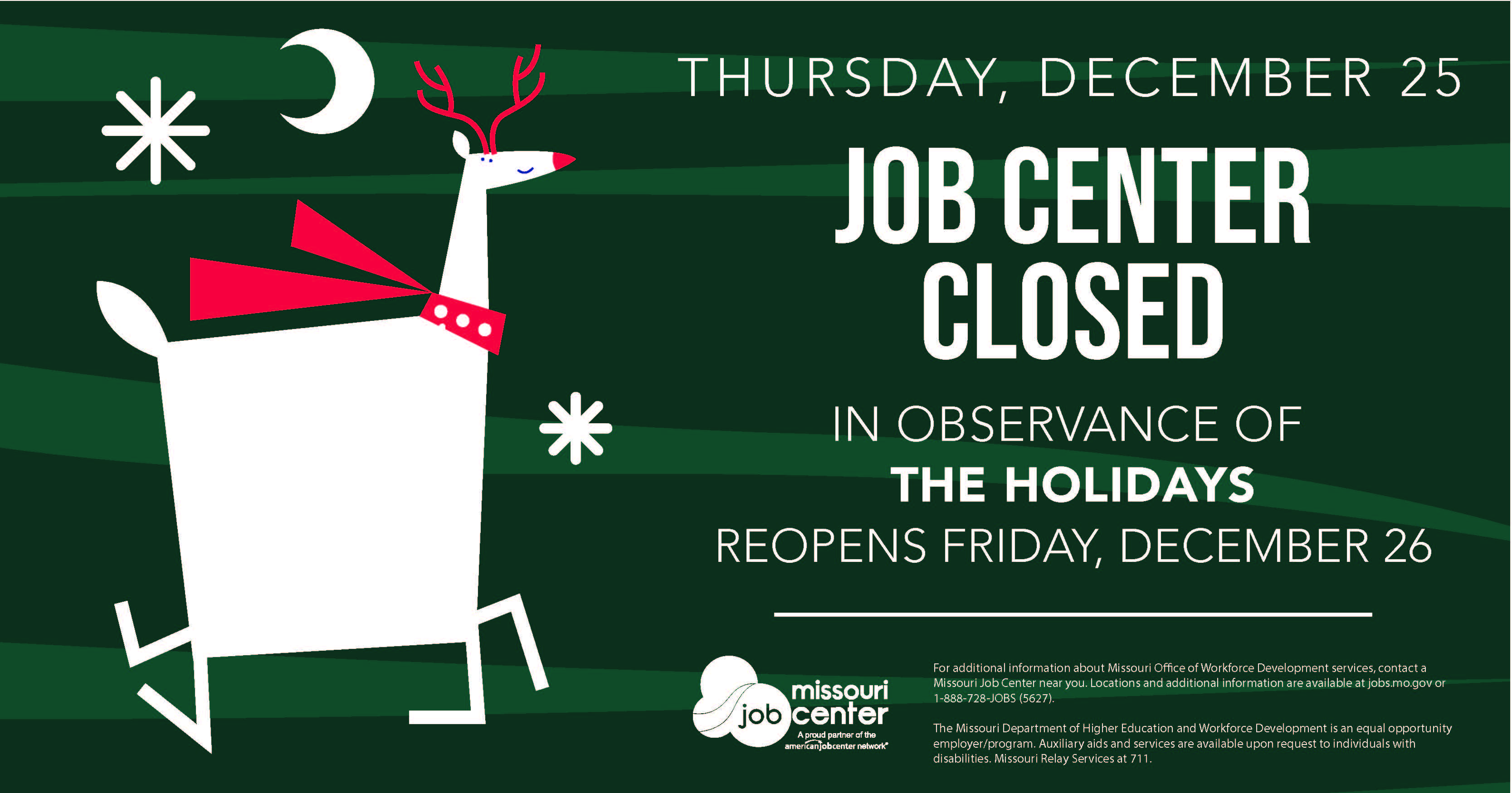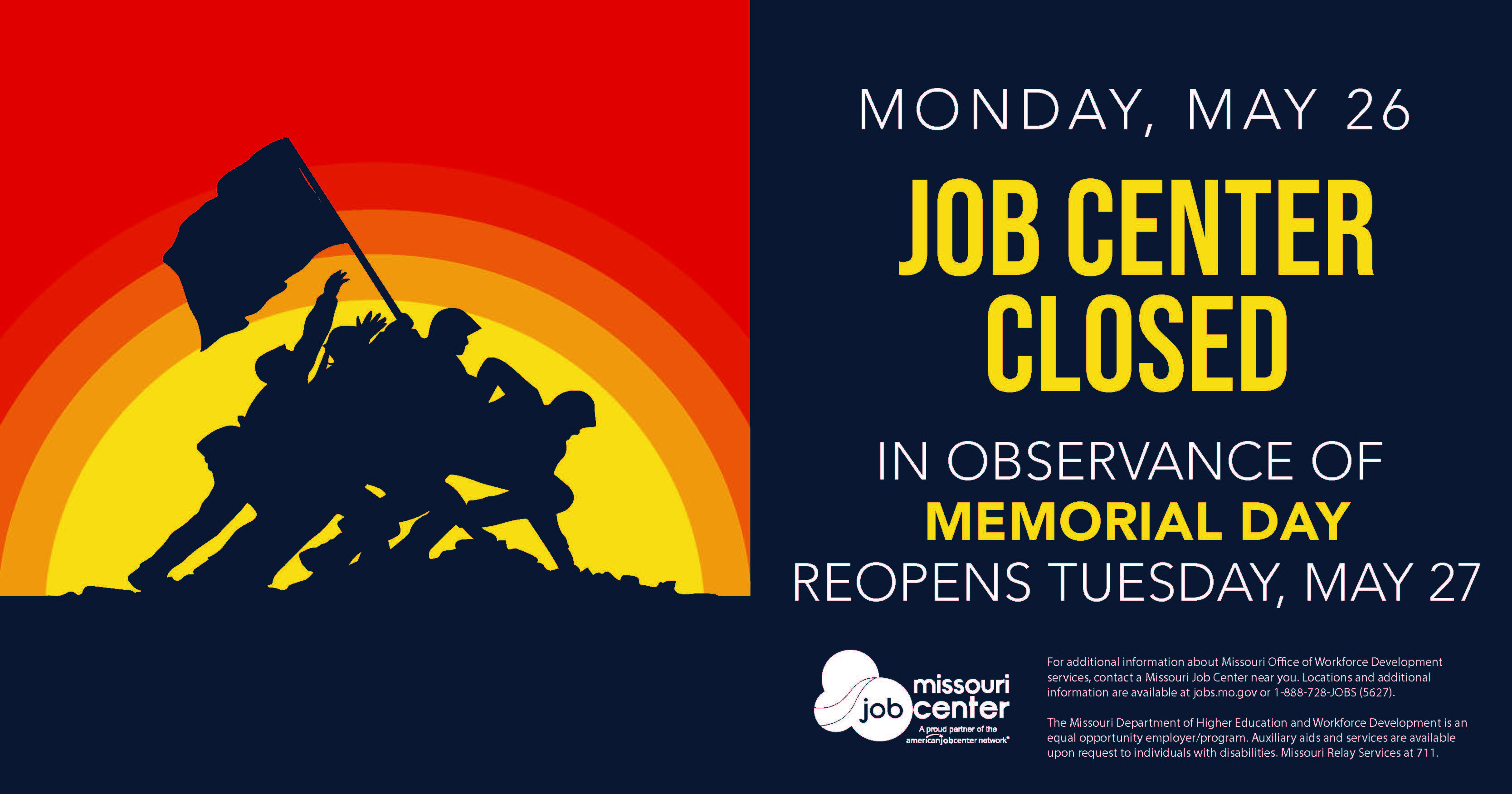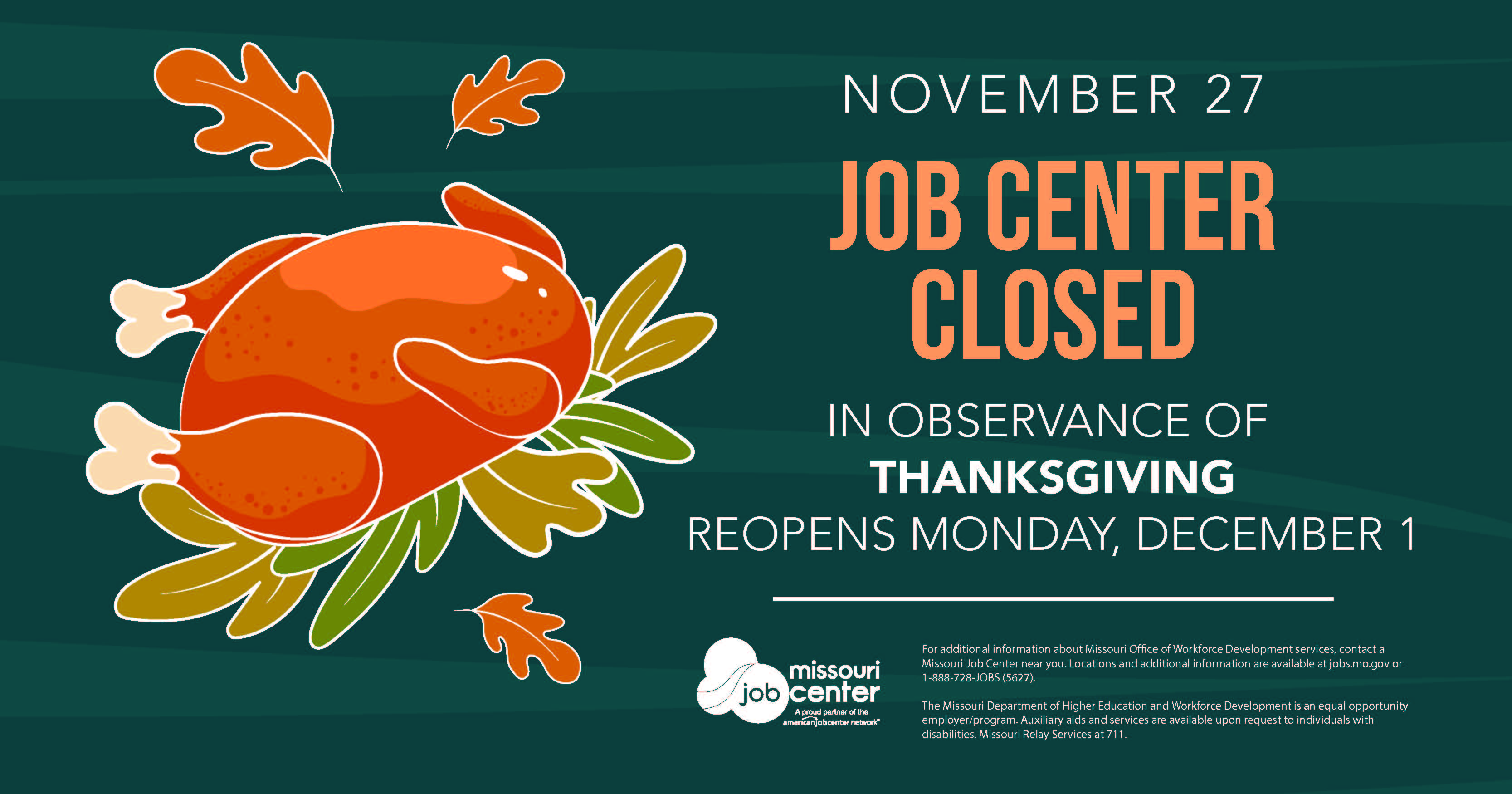 For additional information about Missouri Office of Workforce Development services, contact a Missouri Job Center near you. Locations and additional information are available at jobs.mo.gov or 1-888-728-JOBS (5627).