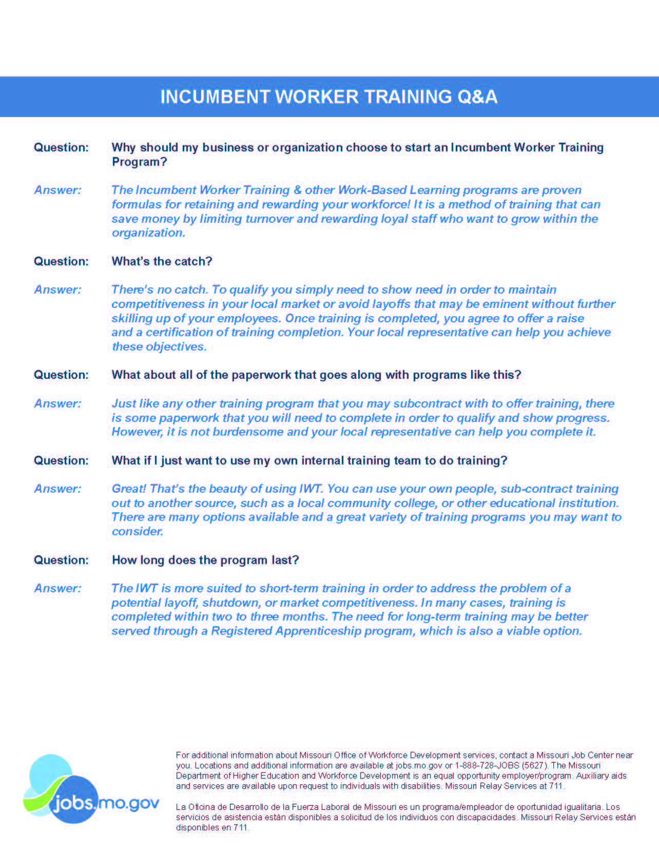 Program manual providing operating procedures for the implementation of the WIOA Incumbent Worker Training Program |